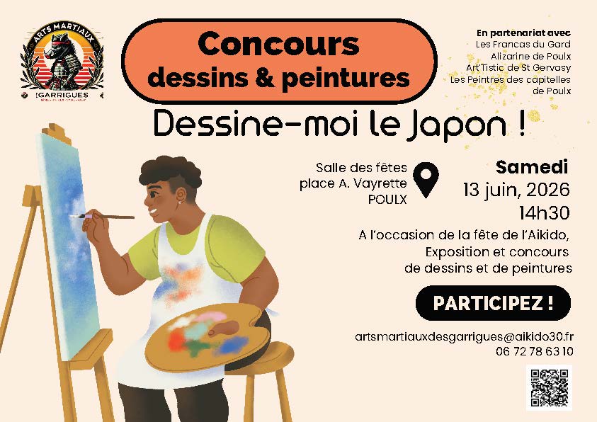 A l’occasion de la Fête de l’Aikido le 13 juin, Arts Martiaux des Garrigues (Nîmes-Poulx et St Gervasy organise un concours de dessins et peintures sur le thème du Japon. Toutes les oeuvres seront exposées le 13 juin 2026 dans la salle des fêtes de Poulx. Le public présent à la Fête de l’Aikido désignera par son vote les lauréats quiu seront récompensés.