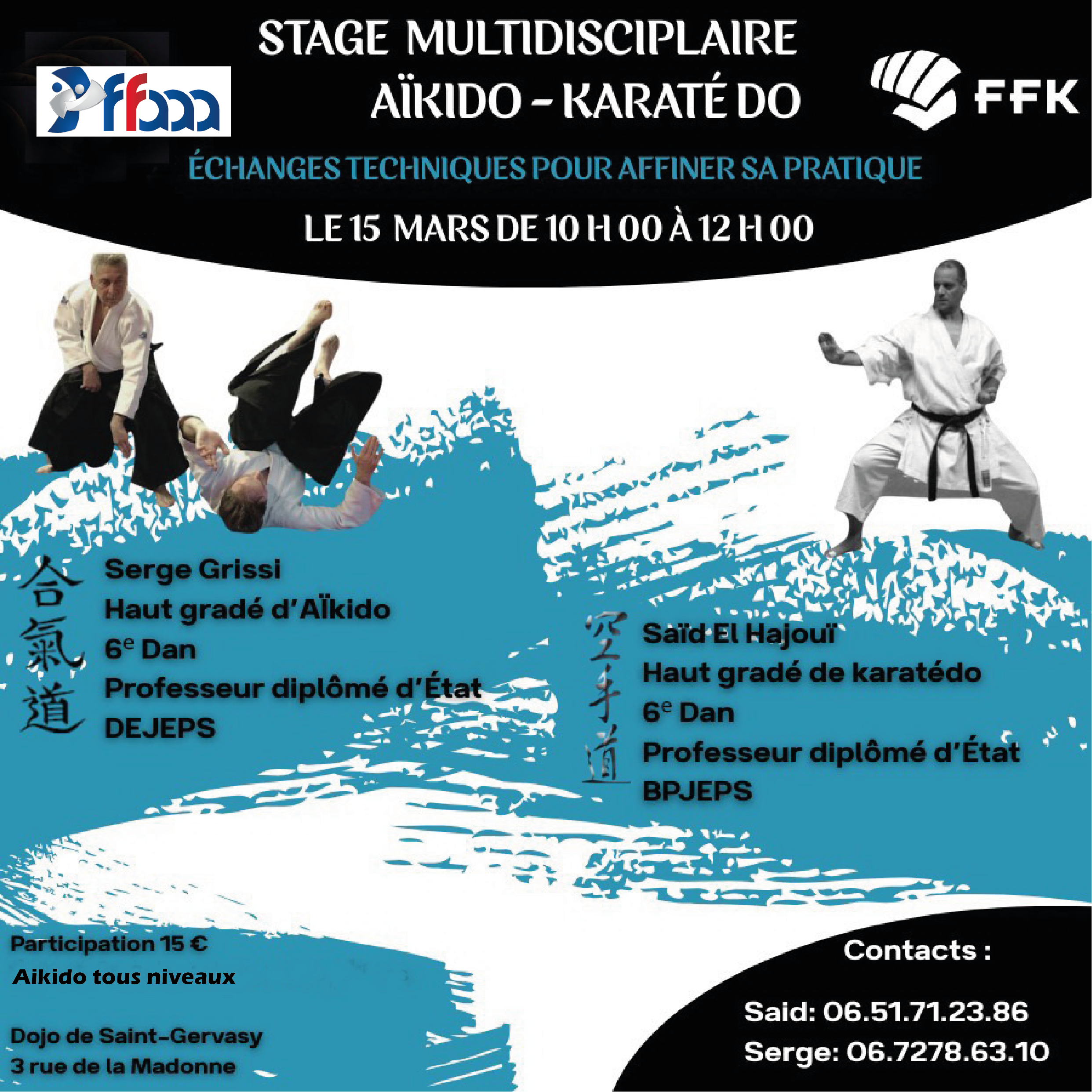 Stage multidisciplinaire Aikido/Karaté le dimanche 15 mars animé par Serge GRISSI et Saïd EL HAJAOUI, tous deux 6 ème dan le dimanche 15 mars de 10h à 12h au dojo de St Gervasy , 3 rue de la Madone.